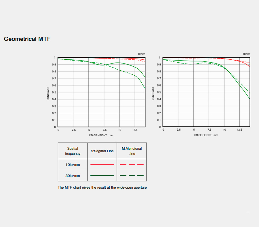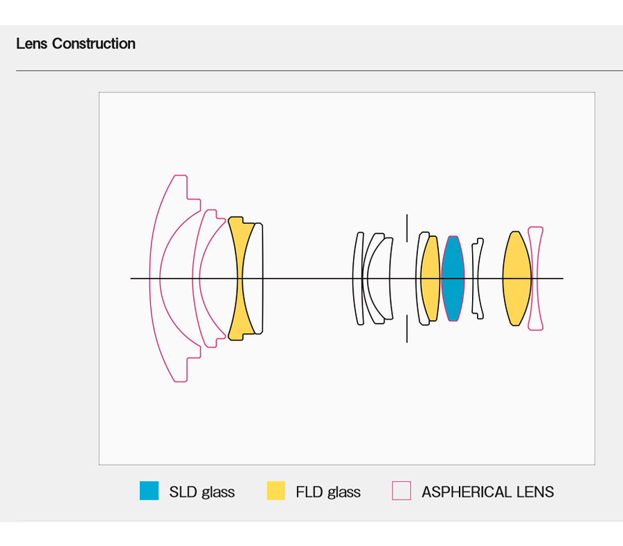 Оптическая схема сложная: 13 элементов в 10 группах, из них 8 специальных – 4 элемента со сверхнизкой дисперсией (3 FLD, 1 SLD) и 4 асферические линзы. Судя по графикам MTF, по резкости объектив не уступает модели Tamron (хотя и не превосходит ее), а специальные элементы должны исправить большую часть искажений, включая дисторсию и хроматические аберрации.
