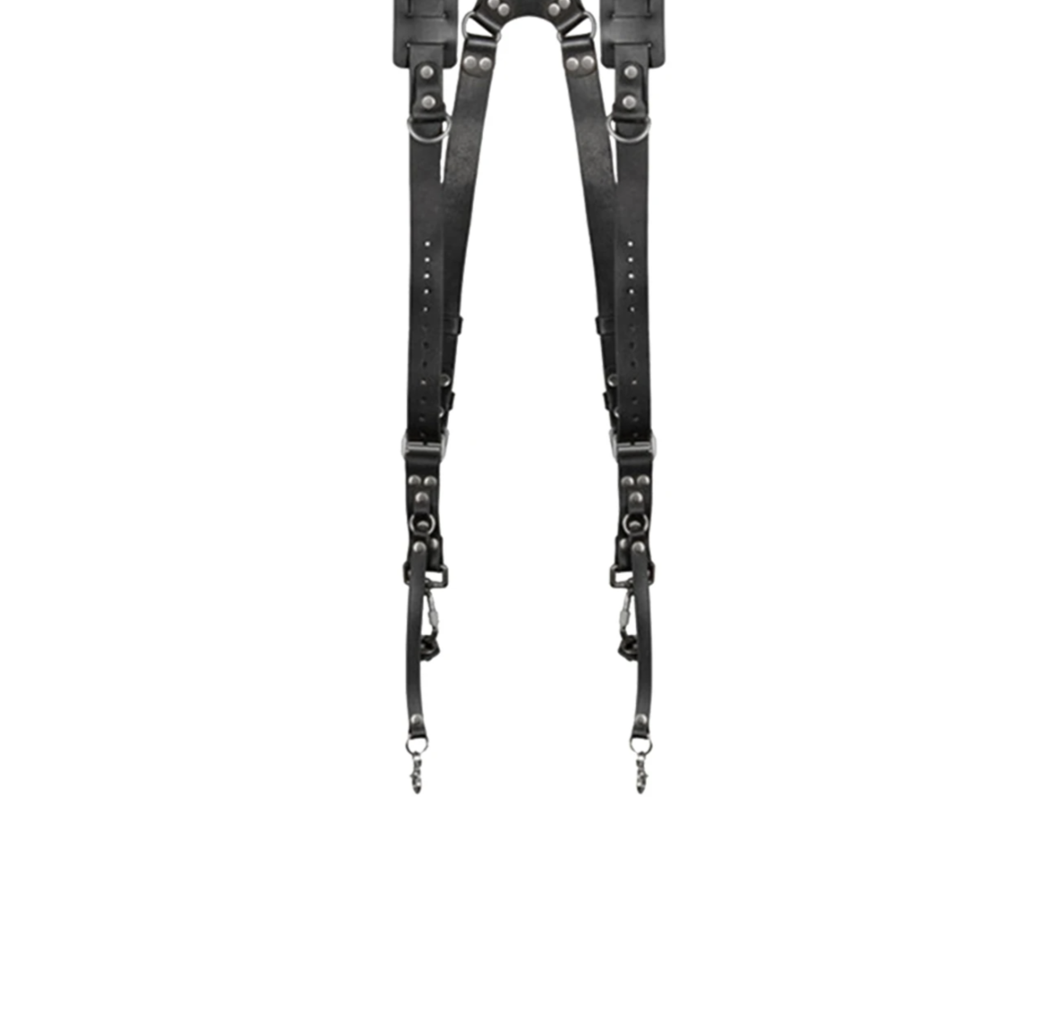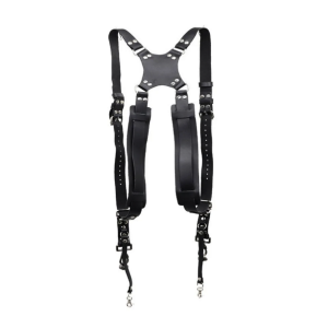 Ремень изготовлен из качественных материалов и фурнитуры. Надевается через плечи на манер портупеи. При необходимости, если используется одна камера, одну из крепежных лямок можно застегнуть на себя, и она не будет мешать в работе.